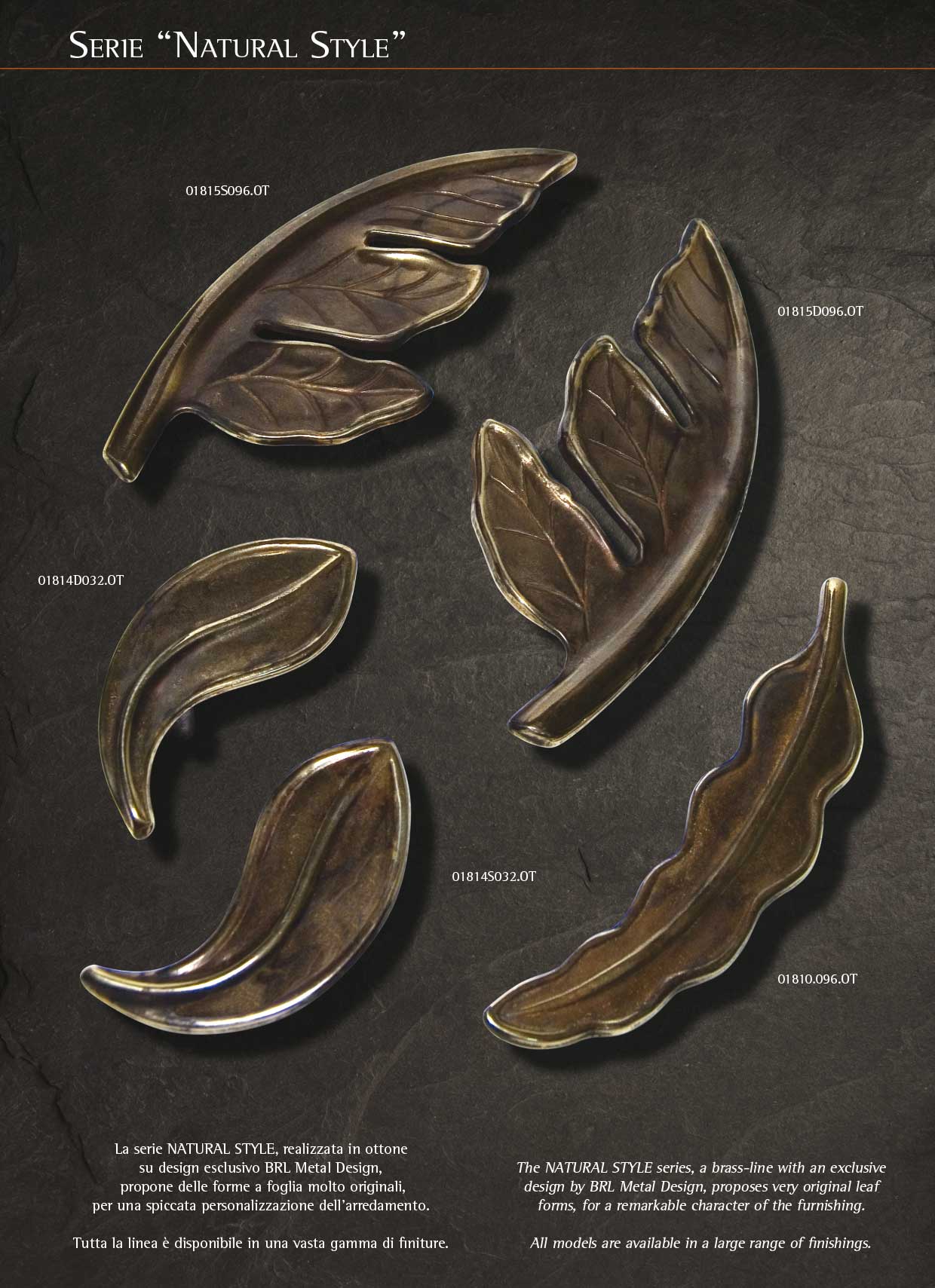La serie NATURAL STYLE, realizzata in ottone su design esclusivo BRL Metal Design, propone delle forme a foglia molto originali, per una spiccata personalizzazione dell’arredamento.